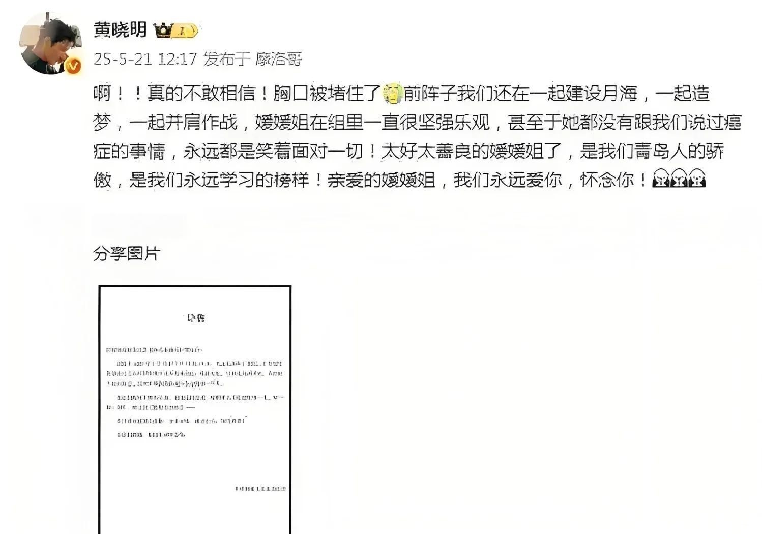 黄晓明发文悼念朱媛媛:她都没跟我们说过癌症的事情 红星新���:12